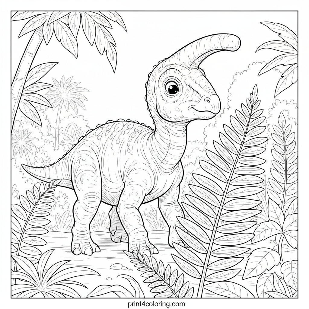 Curious Little Parasaurolophus in the Fern Forest Coloring Page