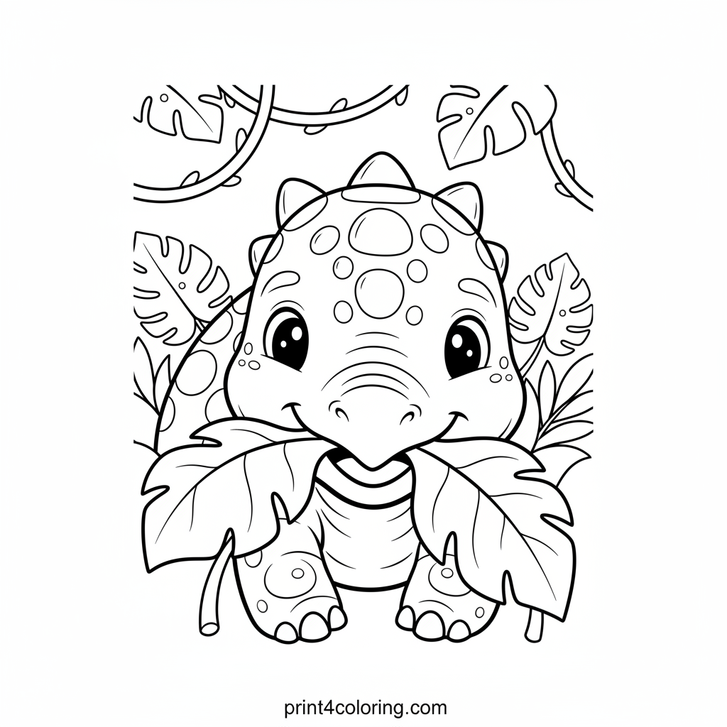 Meet our adorable baby Ankylosaurus, happily enjoying a delicious leafy lunch! This little dinosaur has big, friendly eyes and a cozy, bumpy back. Surrounded by lush jungle plants, it's a perfect scene for young dinosaur lovers to color and bring to life with vibrant shades.