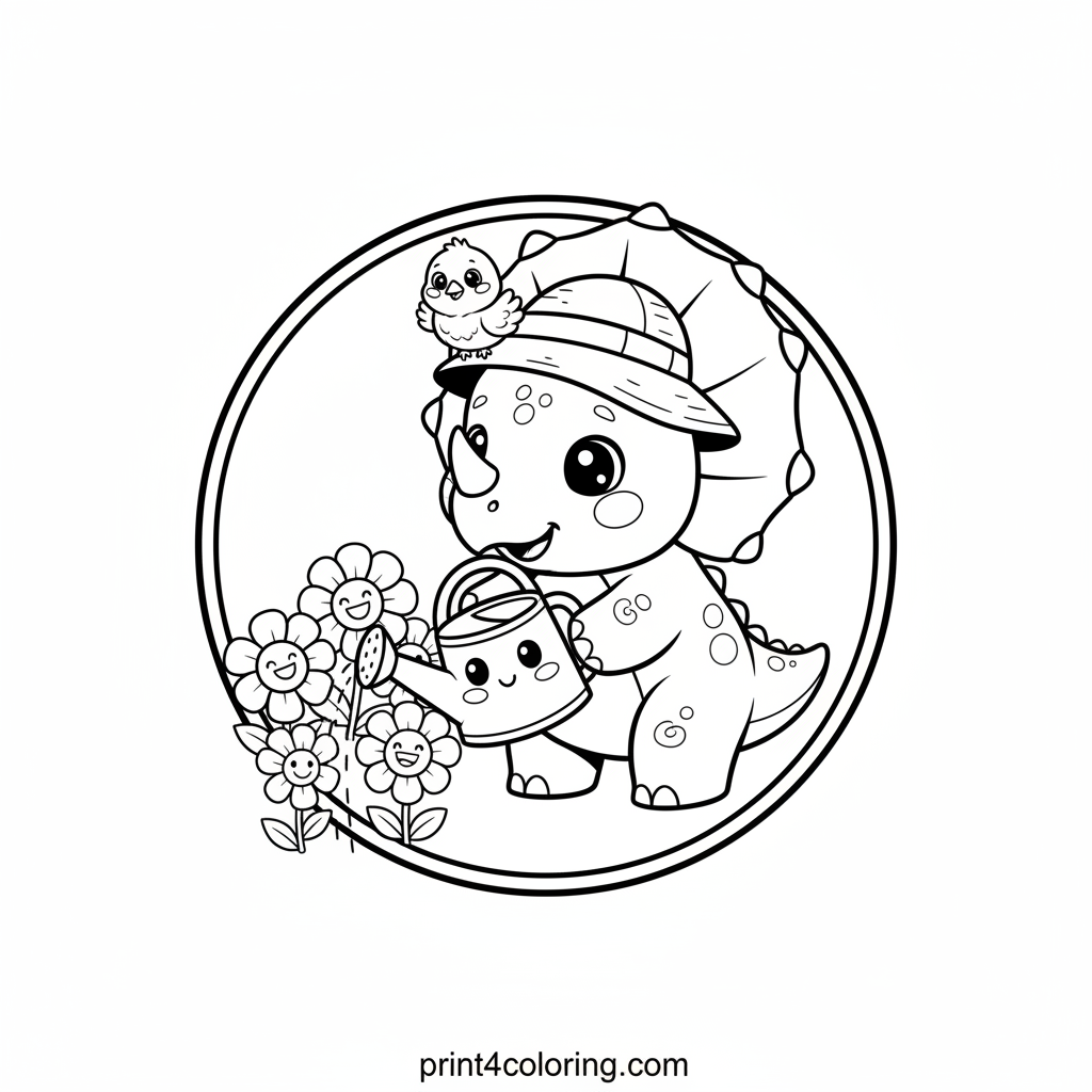 Join our adorable triceratops friend, wearing a tiny gardening hat, as it lovingly waters a patch of giant, cheerful flowers! A happy little bird perches on its frill, adding to the charm. This cozy scene invites you to add vibrant colors to a prehistoric gardener and its beautiful blooming world.