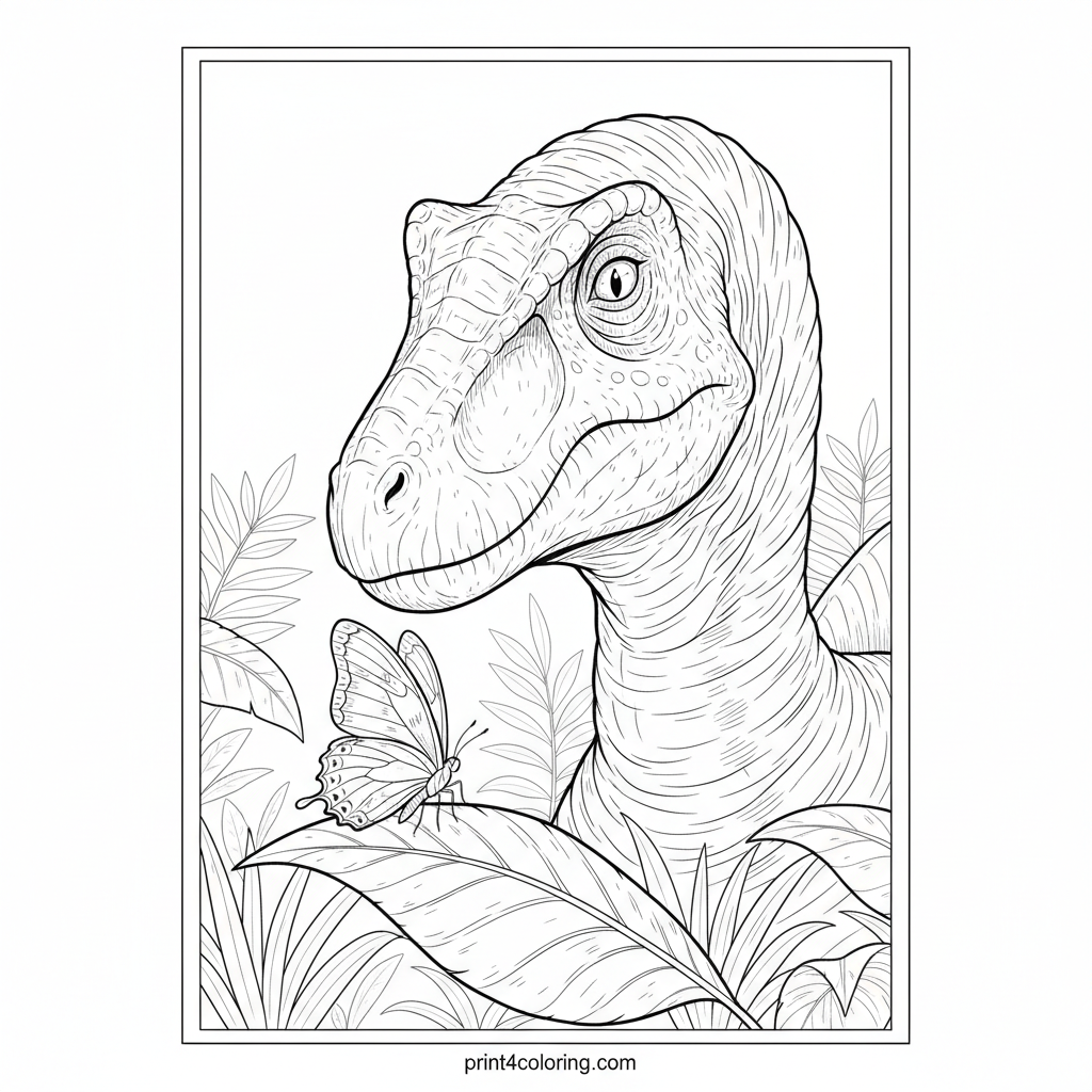 Imagine a magnificent Spinosaurus, a gentle giant, pausing at the forest edge. Its head is tilted, observing a delicate butterfly resting on a giant leaf. Explore the intricate textures of its skin and majestic sail as you bring this peaceful moment to life with your colors. A beautiful scene of prehistoric serenity!