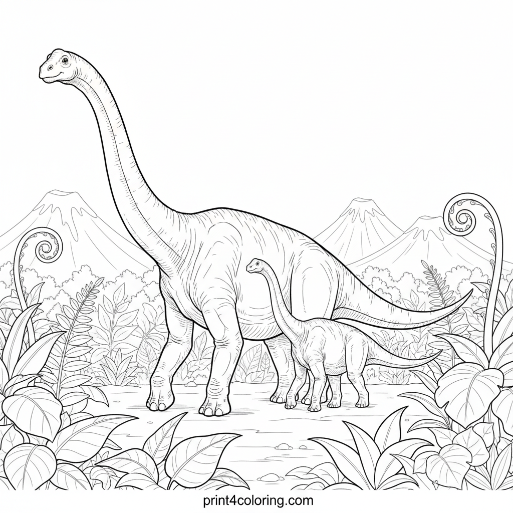 Step back in time to color a magnificent Brachiosaurus family! An enormous adult and its curious juvenile wander through a lush prehistoric world. Bring to life towering ferns, exotic plants, and distant volcanoes. Focus on their textured skin and powerful legs as they embark on an epic journey.