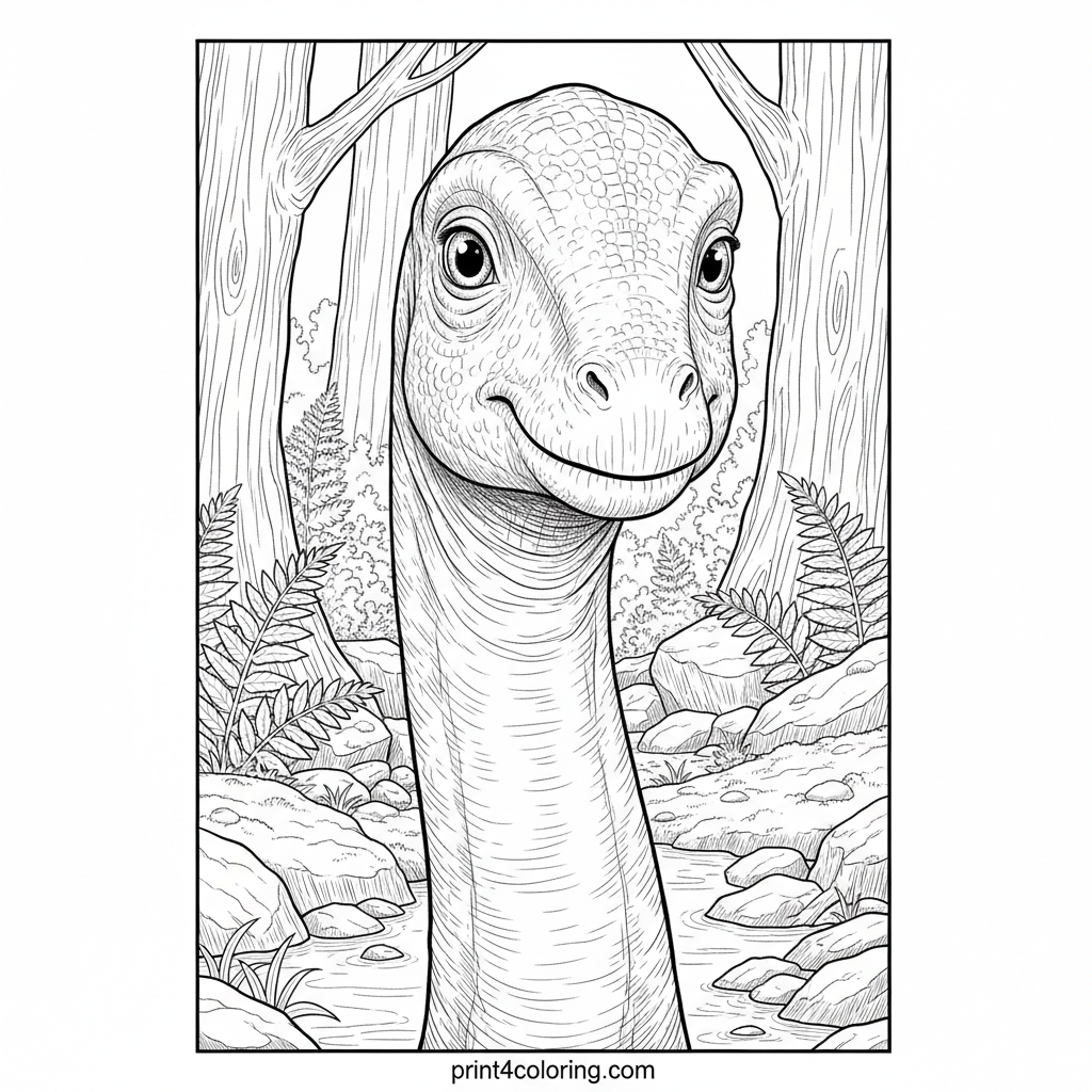 A young Brachiosaurus gently sips from a clear stream, its kind eyes observing the ancient world. Detailed ferns, mossy rocks, and towering trees create a lush backdrop. This intricate portrait challenges expert colorists to bring a majestic prehistoric scene to vibrant life.