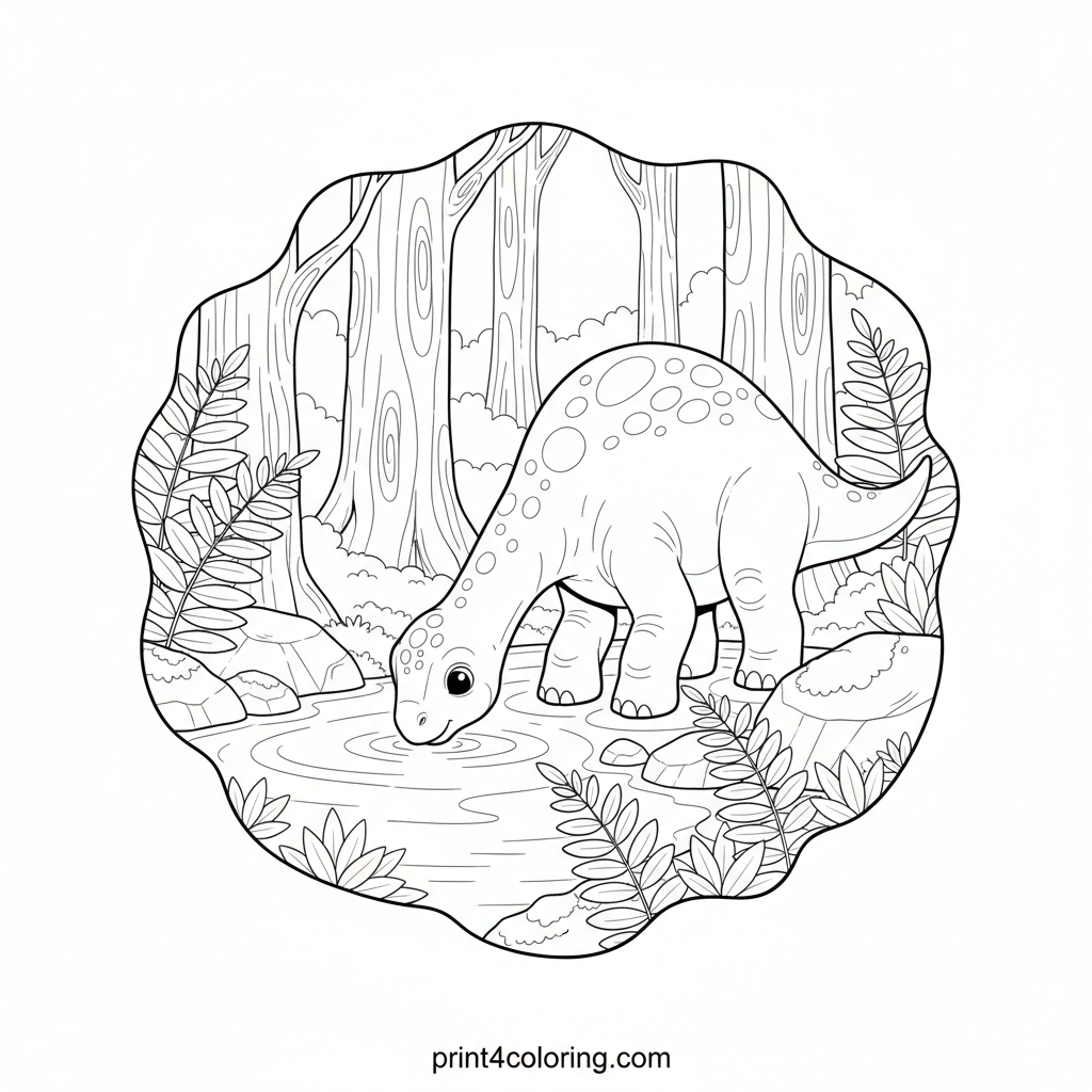 Immerse yourself in a prehistoric paradise! Color a young Brachiosaurus with kind eyes as it sips from a crystal-clear stream. Explore the rich details of lush ferns, moss-covered rocks, and ancient trees, bringing this serene dinosaur scene to vibrant life for expert colorists.