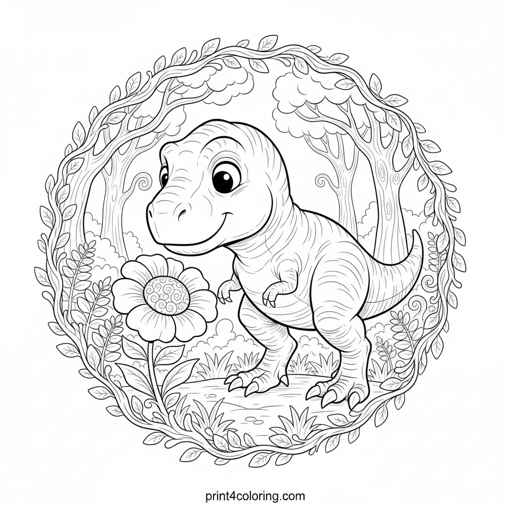 Imagine a mighty Tyrannosaurus Rex, not roaring, but gently exploring a lush prehistoric forest. With powerful legs and magnificent scales, this gentle giant pauses to observe a vibrant, unfamiliar flower. This detailed scene invites you to bring a world of ancient wonder to life with your colors.