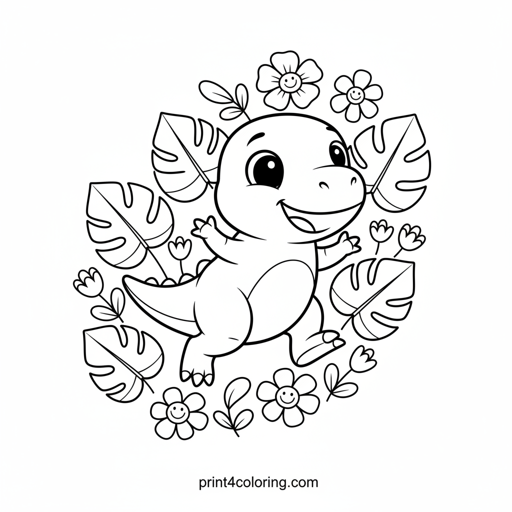 Meet our super cute baby T-Rex, sporting an enormous, happy smile! With friendly eyes, this little dinosaur is enjoying his jungle home. He's surrounded by large, rounded leaves and cheerful flowers, all ready for your creative touch. Grab your crayons and bring this happy prehistoric scene to vibrant life!