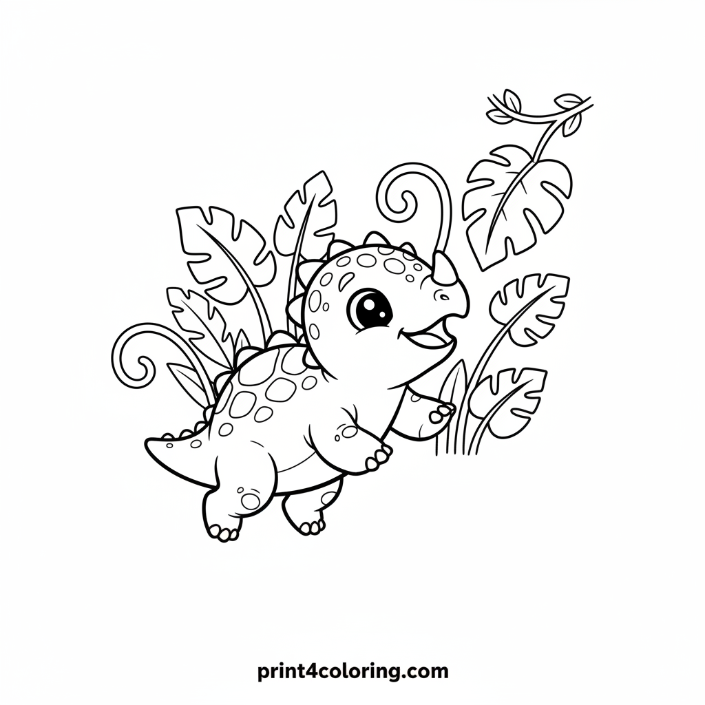 Meet a super cute baby Ankylosaurus with big, friendly eyes, enjoying a tasty jungle snack! This gentle dinosaur happily munches on a giant, delicious leaf, surrounded by lush plants. Its bumpy back looks like a cozy little hill. Get ready to add vibrant colors to this prehistoric feast and bring this happy scene to life!