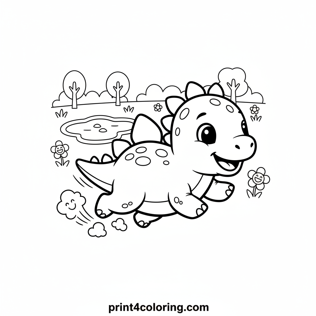Imagine a super happy stegosaurus having a blast in the park! This friendly dino is gently running, kicking up little puffs of dust with a big smile on its face. Its back plates are smooth, and its tail has soft, blunt nubs, making it perfect for a fun, safe adventure. Grab your crayons and bring this playful scene to life!