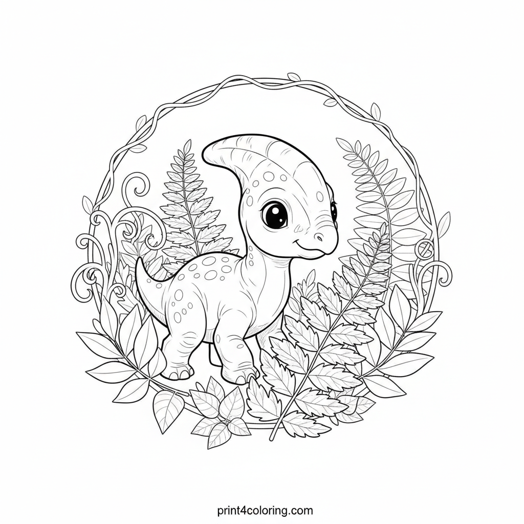 Join a curious baby Parasaurolophus on an exciting journey through a vibrant prehistoric fern forest. With big, wondering eyes, our little friend carefully explores the giant fronds, eager to discover the secrets of its ancient world. A delightful scene for young explorers to bring to life with color!