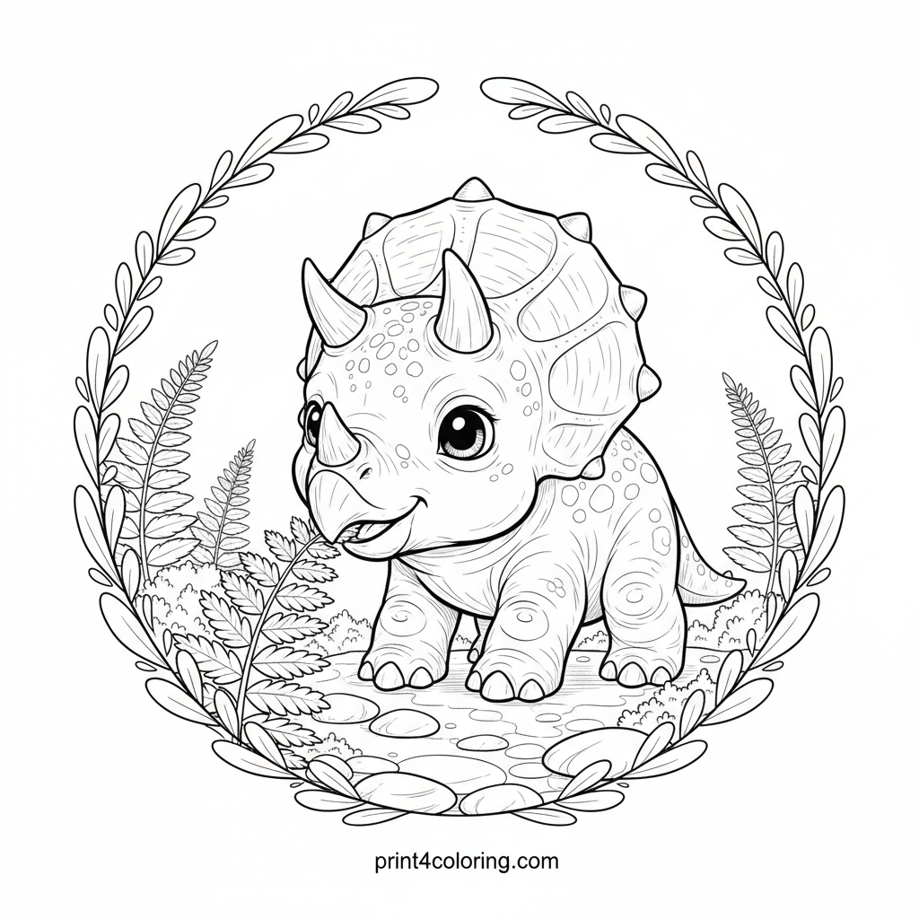 Join a curious baby triceratops as it explores a lush prehistoric forest! With big, inquisitive eyes, this adorable dino gently sniffs a giant fern, discovering new wonders. The forest floor is full of interesting textures like moss and stones, waiting for your colorful touch. Bring this cozy ancient scene to life!