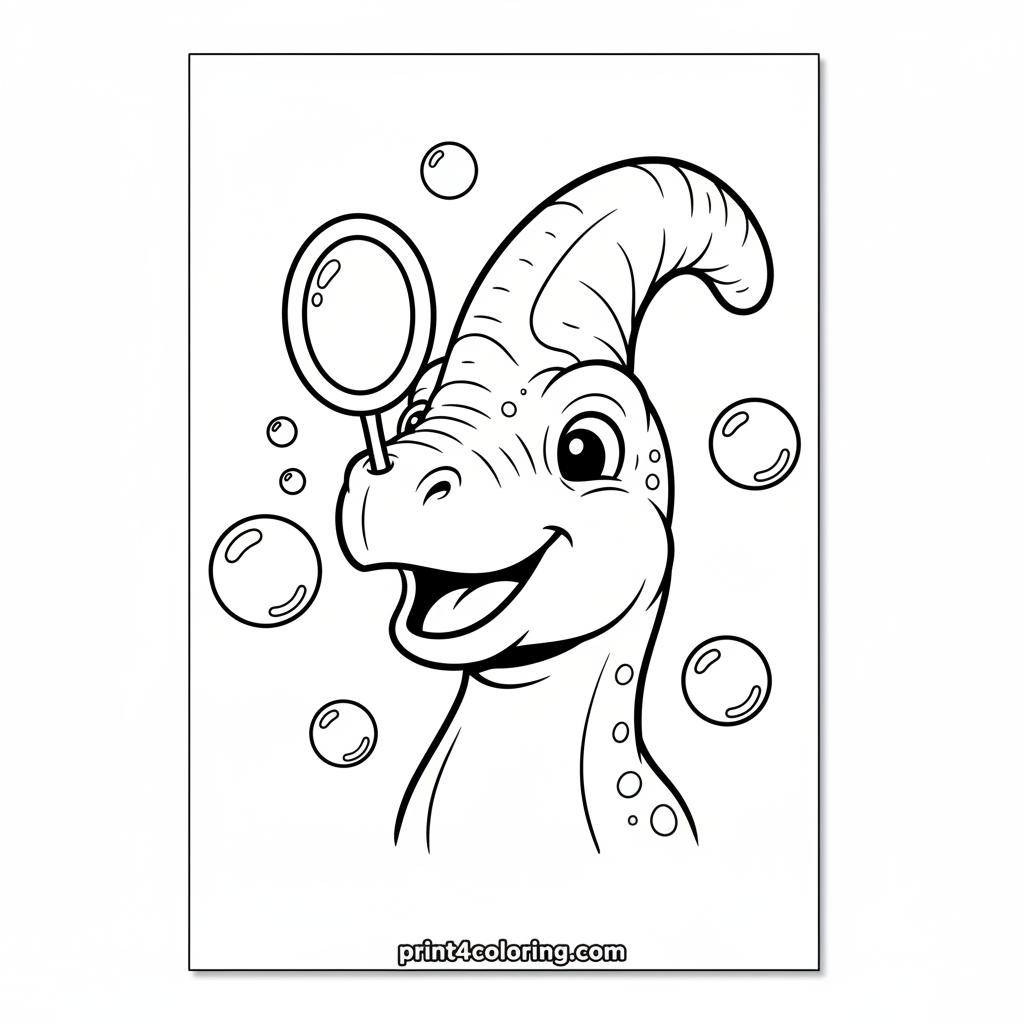 Get ready for bubbly fun! This cheerful Parasaurolophus uses its amazing crest as a giant bubble blower. Watch as huge, round bubbles float all around, filling the air with joy. Our dino friend has a wonderfully happy, surprised expression, making this a delightful scene to color.