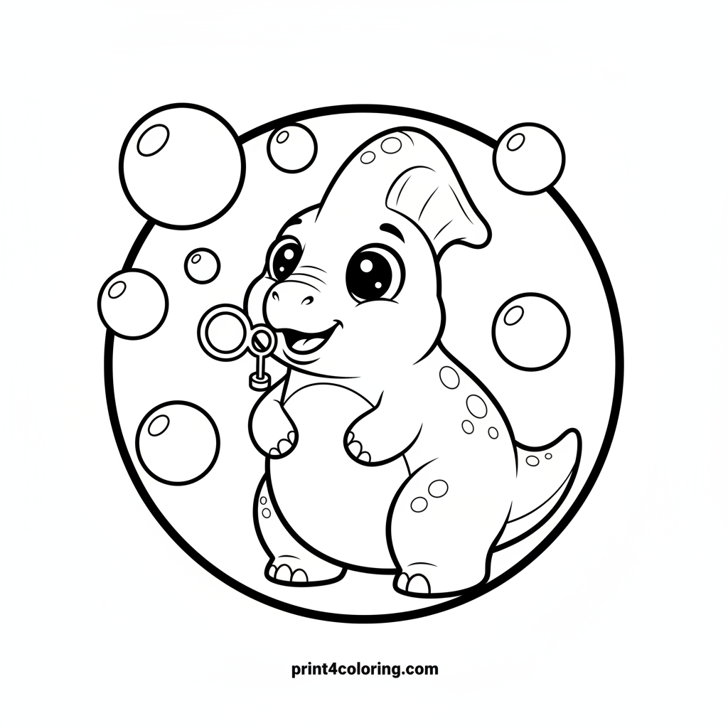 Join a cheerful Parasaurolophus for some bubbly fun! Watch as this friendly dinosaur cleverly uses its amazing crest like a giant bubble wand, creating huge, shimmering bubbles that float all around. With a happy, surprised expression, it's a truly delightful scene. Bring this cute dinosaur adventure to life with your favorite colors!