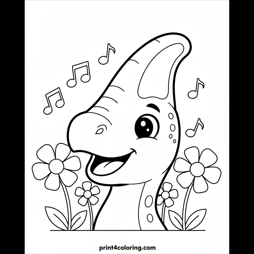 Join a friendly Parasaurolophus as it prepares to sing a happy tune! This gentle dinosaur stands in a field of big, simple flowers, its unique crest ready to create beautiful music. Imagine the joyful sounds as musical notes float around its head. Grab your crayons and bring this prehistoric scene to life!