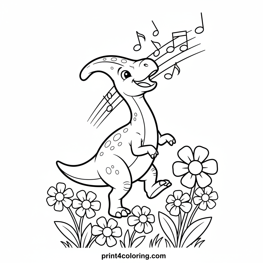 Get ready to color a cheerful Parasaurolophus! This friendly dinosaur is standing in a field of big, simple flowers, looking like it's about to make a happy sound through its long crest. Musical notes float gently around its head, inviting you to bring this prehistoric melody to life with your favorite colors.