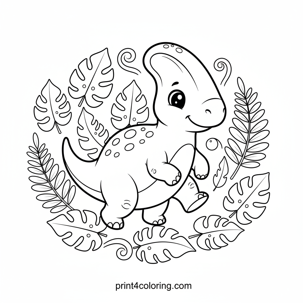 Join our happy Parasaurolophus as it joyfully prances through a cozy, green jungle! With a big smile and its unique crest held high, this friendly dinosaur is tip-toeing past large, welcoming leaves and ferns. Get ready to add vibrant colors to its playful dance and the lush prehistoric world around it. A delightful scene for young paleontologists!