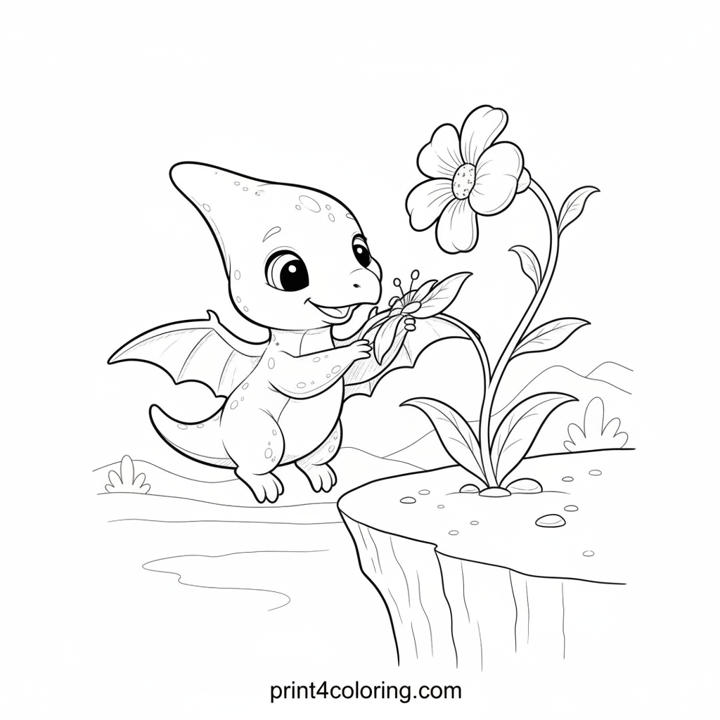 Embark on a journey to a prehistoric world where a graceful pterodactyl gently plucks a vibrant, exotic flower from a cliffside. This detailed scene captures the beauty of ancient flora and the delicate touch of a flying reptile, set against a peaceful primeval landscape, inviting a splash of expert colors.
