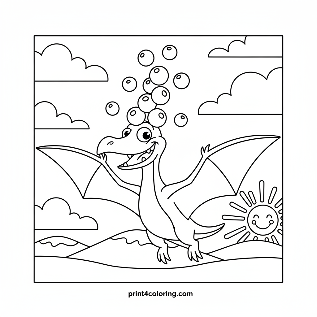 Join a hilariously goofy pterodactyl on a whimsical flight as it tries to balance a wobbly stack of colorful berries on its head! Watch as some delicious berries tumble playfully through the air, creating a delightful mess. This charming scene invites you to add vibrant colors to the flying friend and its fruity snack.