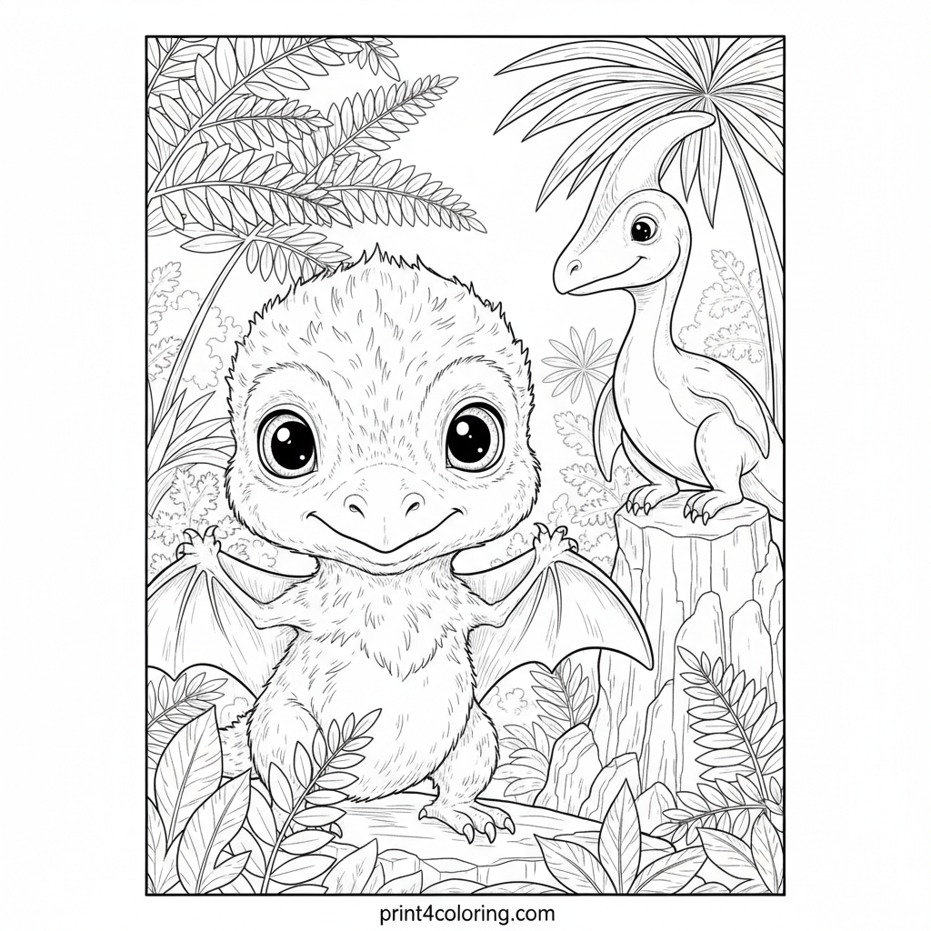 Join a fluffy baby pterodactyl on its exciting first flight lesson! Watch its curious eyes and tentative wing flaps as a gentle adult guides from a rocky perch. Explore a lush prehistoric world filled with detailed ferns and cycads, bringing this heartwarming scene to life with your colors.