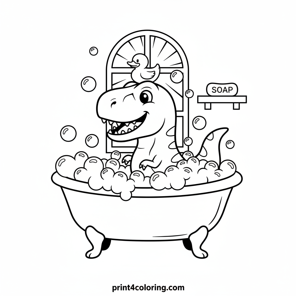 Dive into a bubbly adventure with a friendly T-Rex enjoying a giant bubble bath! This hilarious scene features our happy dinosaur splashing in a big claw-footed tub, surrounded by playful cartoon bubbles. Don't miss the cute rubber ducky balancing on its head. Grab your crayons and bring this joyful prehistoric bath time to life!