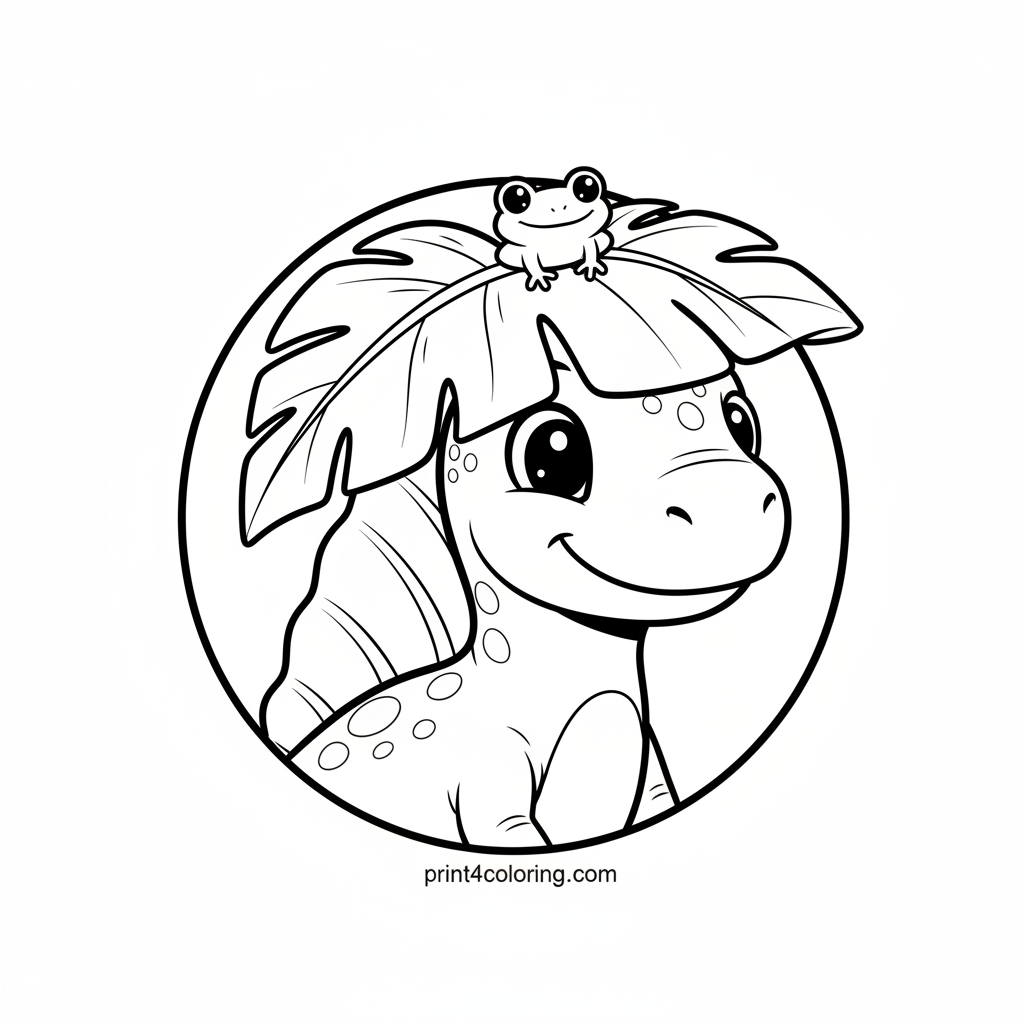 Join Spino, the friendliest Spinosaurus, on a whimsical adventure! With a big, kind smile, Spino balances a giant, silly tropical leaf on its sail like a fashionable hat. Look closely, and you'll spot a tiny, curious frog peeking out from behind the leafy shade, ready to join the fun. A truly cozy prehistoric scene!