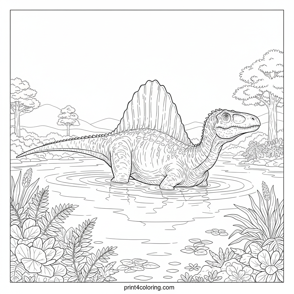 Dive into a prehistoric world with this majestic Spinosaurus! Its unique sail glides through a calm river, surrounded by lush aquatic plants and ancient ferns. Imagine the vibrant colors of this ancient hunter as its powerful tail stirs the water. A thrilling scene for expert colorists!