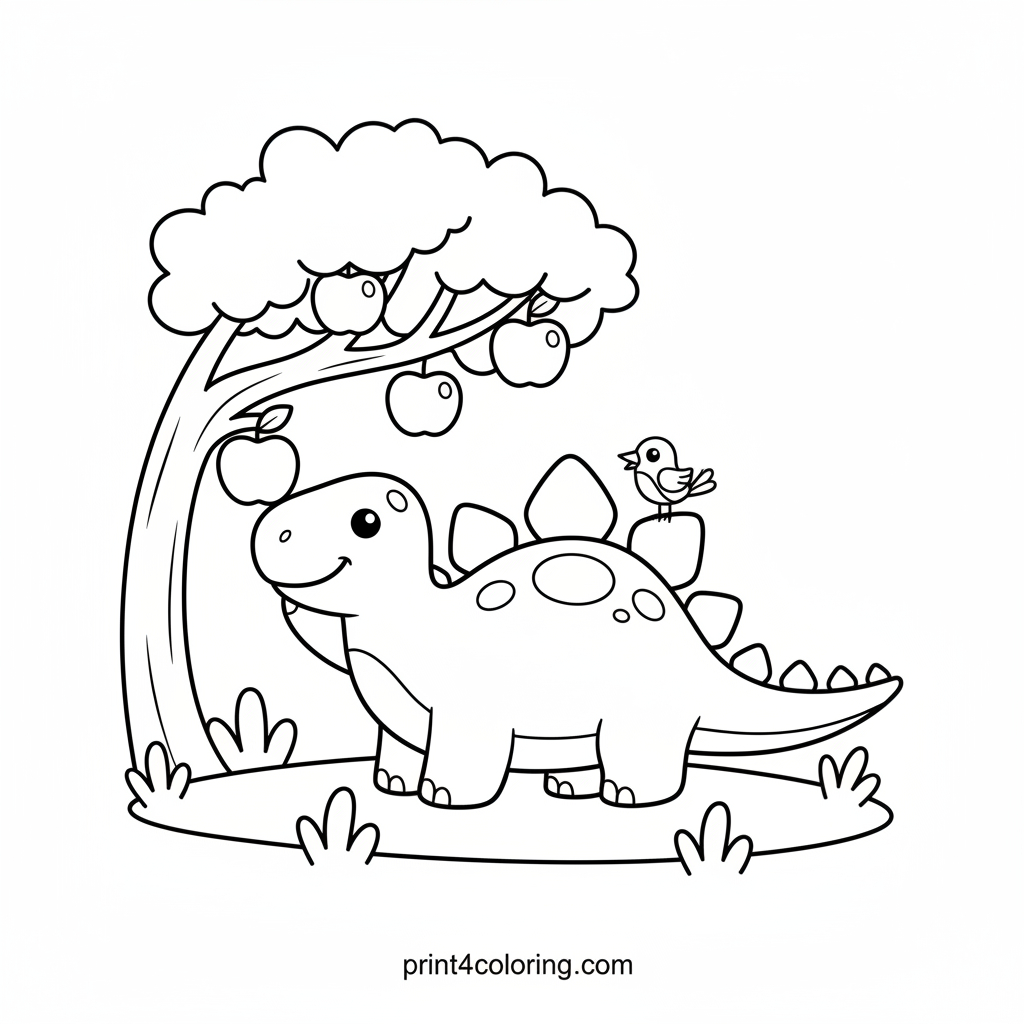 Join a cheerful stegosaurus on a sunny day as it carefully reaches up to pick a juicy, red apple from a low-hanging tree branch. A tiny, curious bird is perched on one of its unique back plates, observing the fun. Get ready to add vibrant colors to this delightful prehistoric fruit-picking adventure!