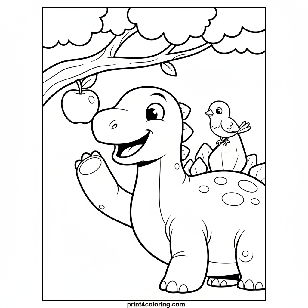 Join a friendly stegosaurus on a delightful fruit-picking adventure! This happy dinosaur is carefully reaching for a big, red apple on a low branch, while a tiny bird watches from its back. A perfect scene for young artists to bring to life with vibrant colors, imagining a prehistoric snack time.