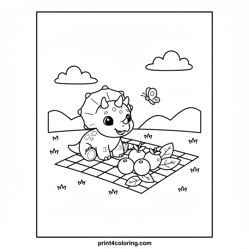 Join our adorable baby triceratops for a delightful picnic! With big, friendly eyes, this little dino is ready to enjoy a feast of giant, cheerful berries and fresh leaves spread on a cozy blanket. A tiny butterfly dances nearby, adding to the magic. Grab your crayons and bring this sweet scene to life!