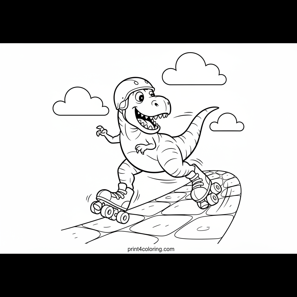Get ready for a prehistoric party on wheels! This happy T-Rex is having a roaring good time, carefully balancing on oversized roller skates down a sunny path. With a silly grin and fluffy clouds above, it's a super fun scene just waiting for your colorful imagination to bring it to life. Grab your crayons!
