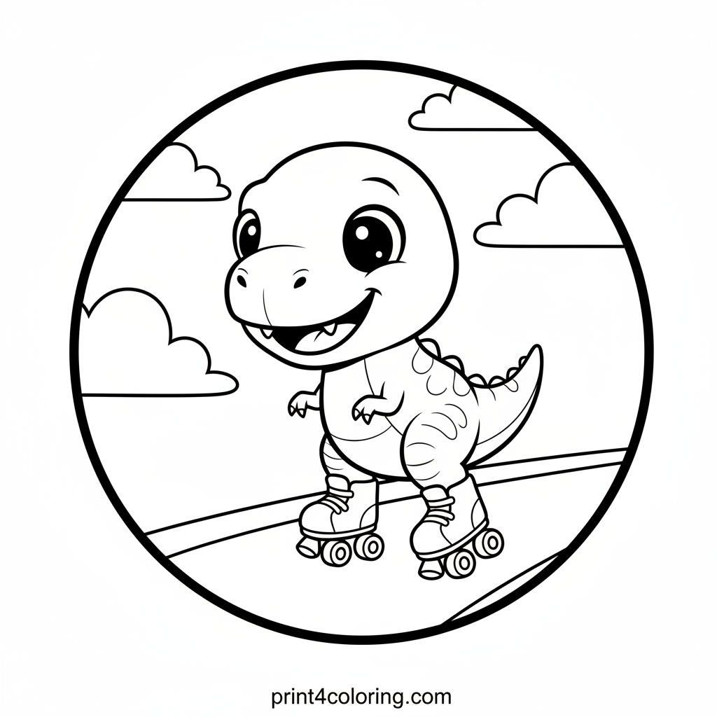 Join our friendly T-Rex as it tries out roller skating for the first time! With oversized skates and a big, happy grin, this dinosaur is carefully gliding down a sunny path. Puffy clouds drift by, making it a perfect day for a silly skate adventure. Get ready to add vibrant colors to this cute and cozy scene!