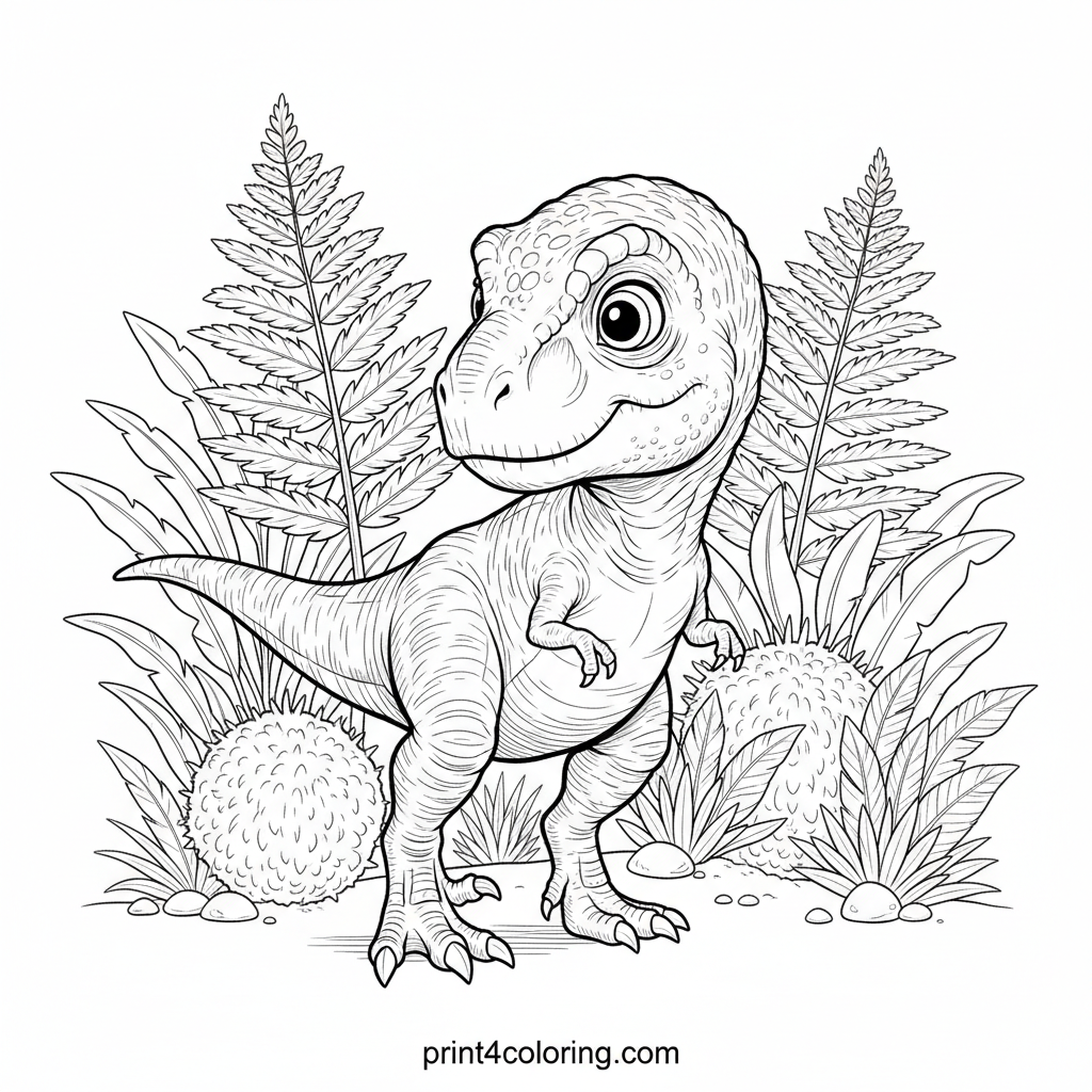 Watch a brand new baby T-Rex take its very first wobbly steps! With big, curious eyes, it explores a world filled with giant ferns and amazing ancient plants. Imagine the colors of this prehistoric jungle as you bring this adorable dinosaur to life. A thrilling adventure awaits your crayons!