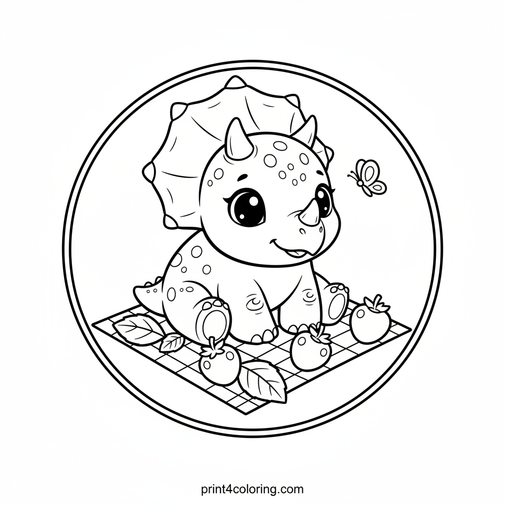Join a sweet baby triceratops with big, friendly eyes as it enjoys a delightful picnic! This cozy scene features giant, cheerful berries and leaves on a picnic blanket, with a little butterfly fluttering nearby. Grab your crayons and bring this adorable prehistoric party to life with vibrant colors!