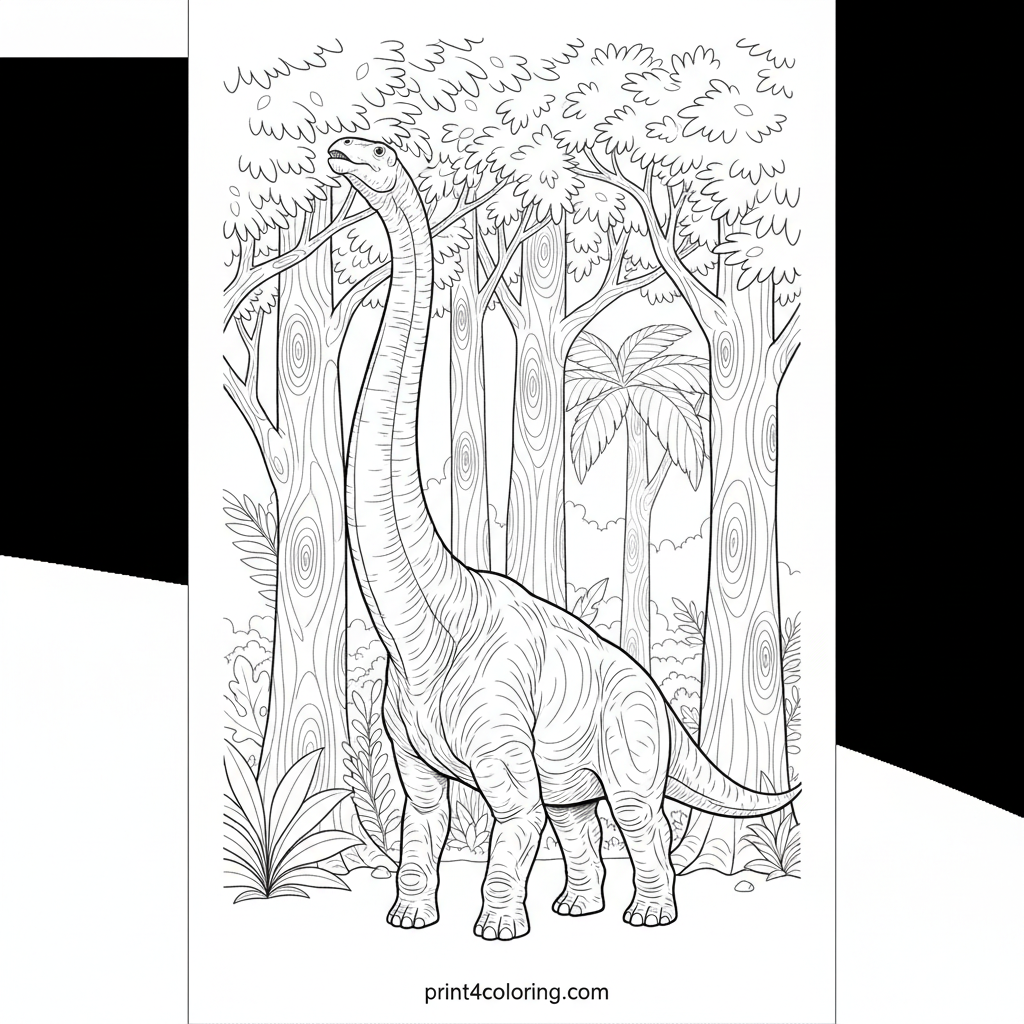 Journey back to the age of giants! This expert coloring page features a magnificent Brachiosaurus stretching its long neck to nibble leaves from ancient trees. Capture the intricate details of tree bark, diverse foliage, and the warm sunlight filtering through the prehistoric canopy. A grand scene waiting for your vibrant colors!