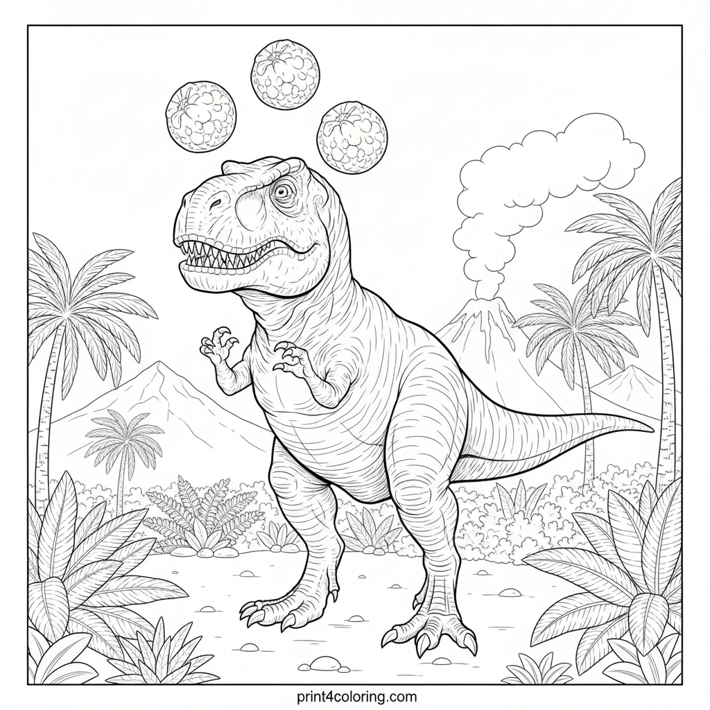 Imagine a colossal T-Rex with a comical expression, its tiny arms struggling to juggle three enormous, colorful prehistoric fruits. This hilarious scene invites young artists to bring vibrant life to the dino's clumsy, yet determined, performance. Get ready for some prehistoric fun!