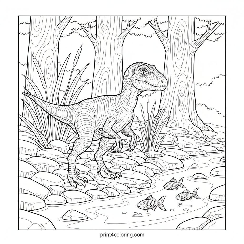 Journey to a prehistoric riverbank! Color a detailed Velociraptor calmly observing small fish in clear water. Intricate river stones, ancient trees with textured bark, and lush reeds fill the background, with dappled sunlight filtering through the leaves. Bring this serene ancient scene to life with your vibrant colors.