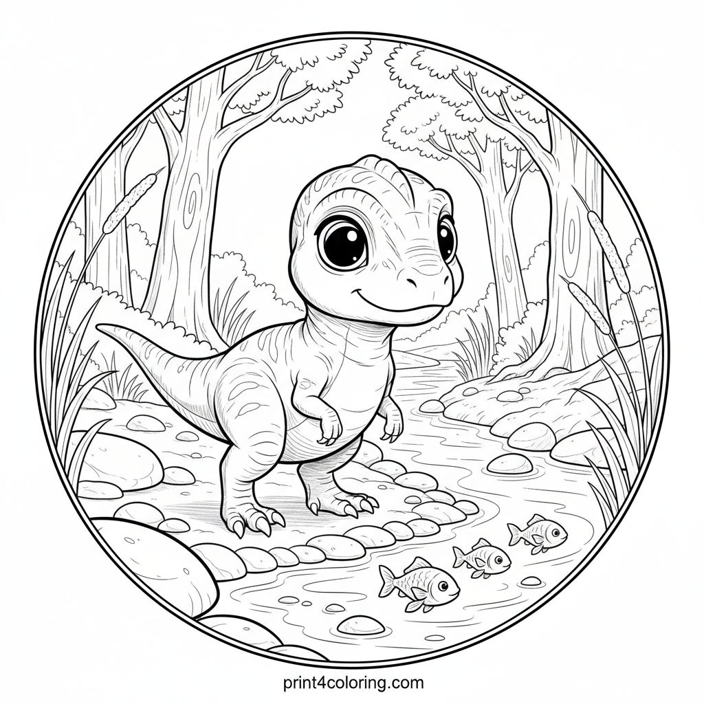 Step into a prehistoric landscape where a gentle Velociraptor peacefully observes tiny fish in a clear river. This detailed page features ancient trees, textured rocks, and reeds, all bathed in dappled sunlight. An expert challenge to bring this serene moment to life with vibrant shades and intricate details.