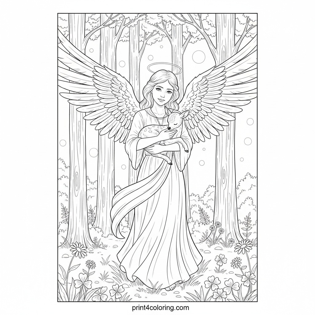 Discover a heartwarming scene where a kind angel, with soft features and magnificent wings, tenderly cradles a tiny, sleeping fawn. The peaceful forest setting, bathed in dappled sunlight filtering through realistic trees, invites you to bring this comforting moment to life with your most serene colors.