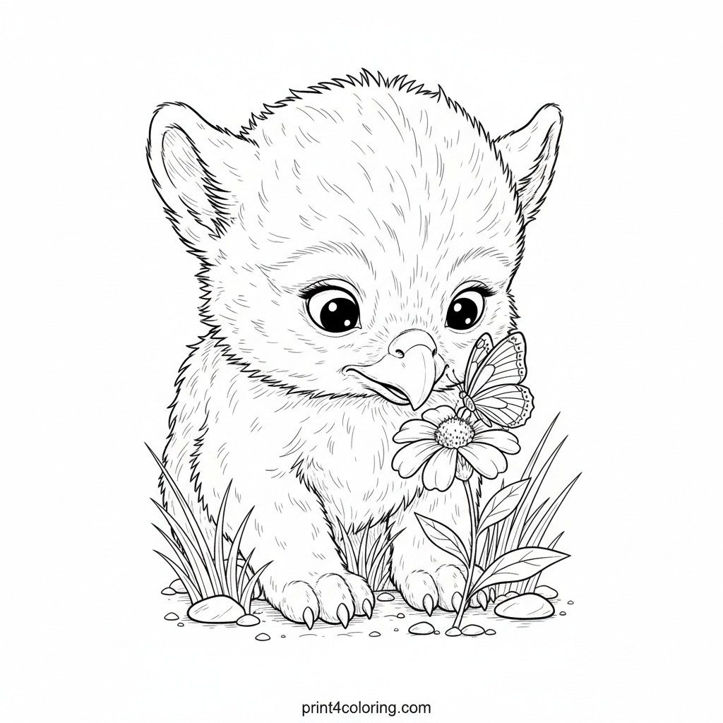 Step into a magical meadow where a fluffy baby griffin, with huge, curious eyes, delicately sniffs a beautiful butterfly on a vibrant wildflower. Bring this heartwarming first encounter to life, coloring soft feathers, delicate wings, and lush grass in this enchanting, detailed scene.