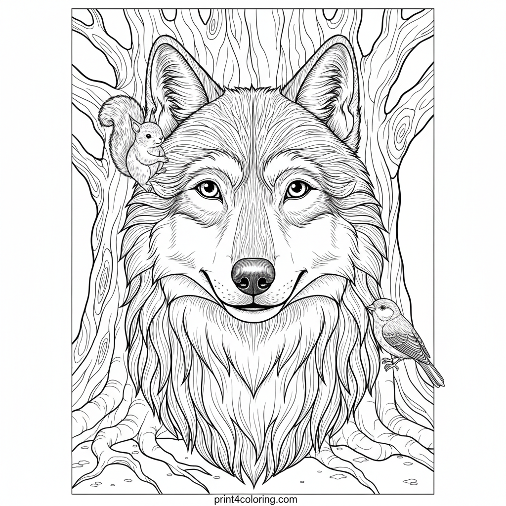 Meet the gentle guardian of the ancient forest! This kind, wolf-like creature watches over a magnificent old oak, its roots twisting deep into the earth. Look closely, and you'll spot tiny squirrels and birds making their home in the branches and around its peaceful feet. A wonderful scene for imaginative coloring!