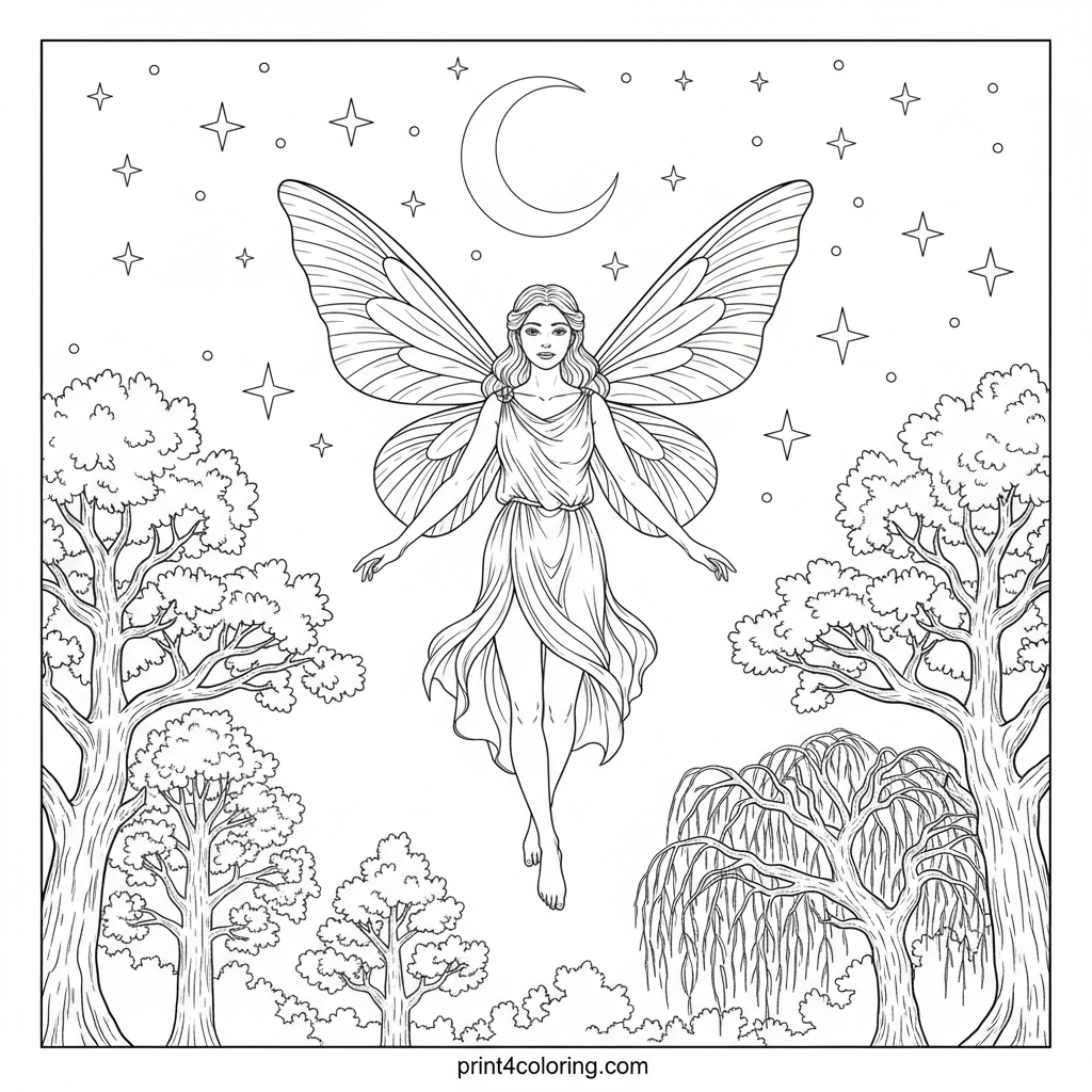 Journey into a magical night where a graceful fairy with shimmering wings dances across the tranquil sky. A radiant crescent moon and countless stars light her path above a forest of detailed trees. This expert scene invites you to bring the moonlit magic to life with your colors, creating a truly enchanting masterpiece.