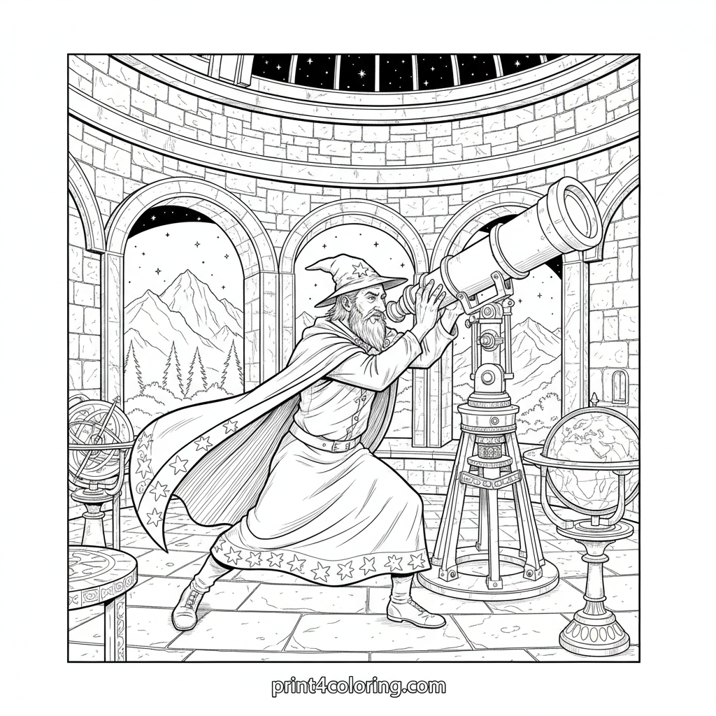Celestial Seeker: Wizard's Grand Observatory Coloring Page