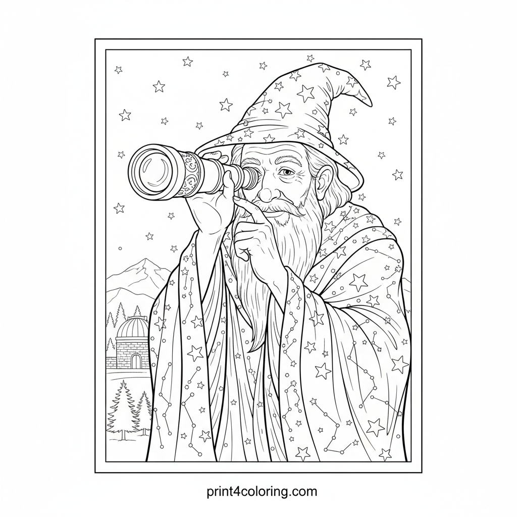 Journey to an ancient observatory with a wise wizard! Color this thoughtful sorcerer in a star-embroidered cloak, peering through a grand brass telescope. Explore celestial wonders under a breathtaking, star-filled sky, complete with distant mountains and mystical trees. Let your imagination soar!