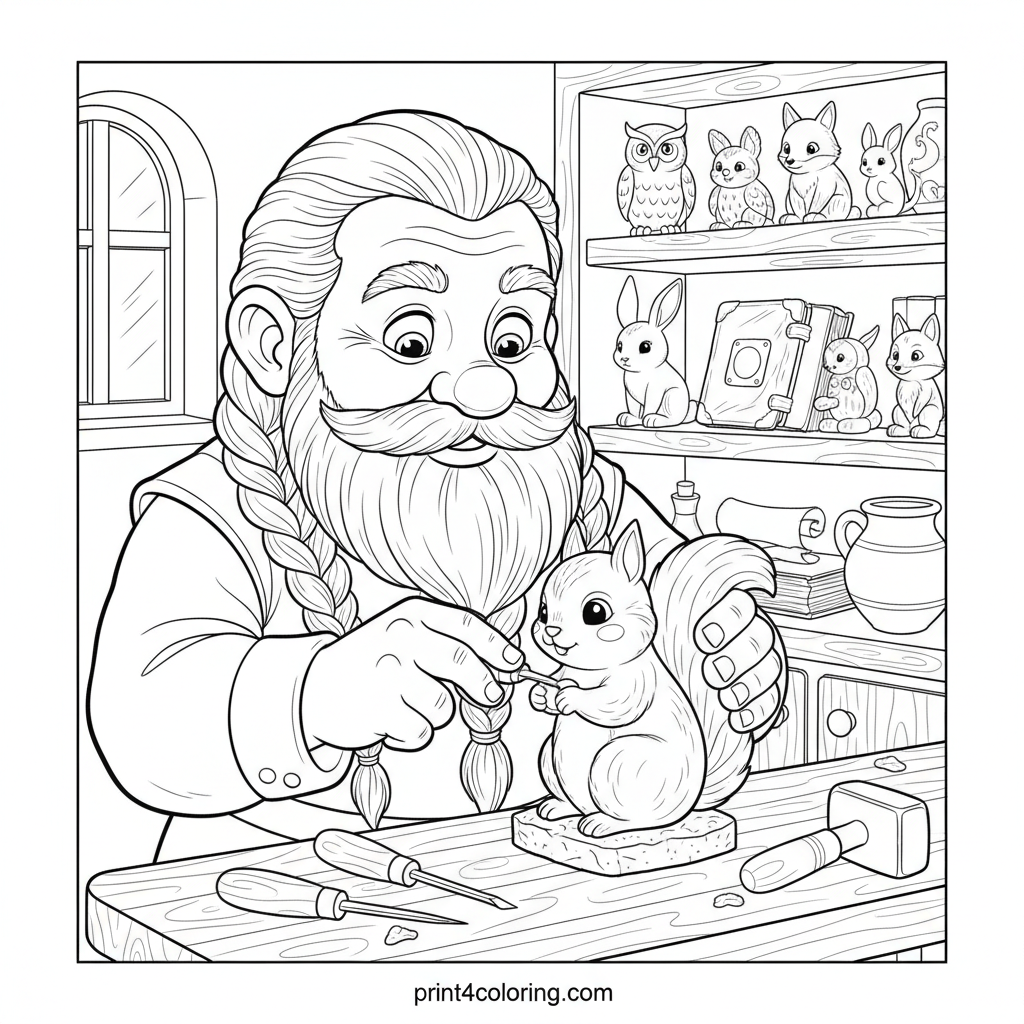 Step into a charming workshop where a wise dwarf, with a long, braided beard, carefully carves a tiny forest friend from stone. Explore shelves filled with amazing sculptures, discover detailed tools, and enjoy the warm sunlight streaming through the window, making this cozy scene perfect for bringing to life with your colors.