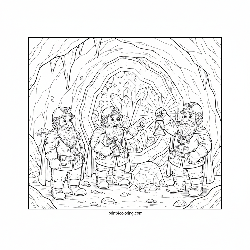 Descend into a wondrous underground cavern with friendly dwarfs! They've discovered a magnificent geode, shimmering with countless crystals. One dwarf points in awe, another explores, while the third illuminates their amazing find. Use your colors to bring this magical, intricate scene of discovery to life!