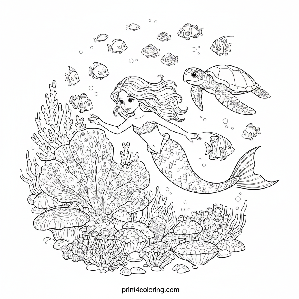 A sweet young mermaid with a curious expression gently touches a vibrant coral fan. She's surrounded by friendly fish and a gentle sea turtle, exploring a detailed underwater world filled with colorful coral, anemones, and schools of shimmering fish. An enchanting scene ready for your creative colors!