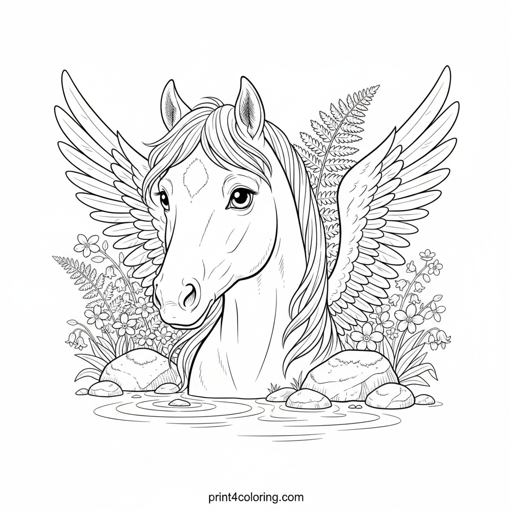 Discover a moment of wonder as a young, curious pegasus gently approaches a hidden forest spring. Its soft features and developing wings are framed by lush ferns, moss-covered stones, and delicate wildflowers. Bring this tranquil, magical scene to life with your most vibrant colors!