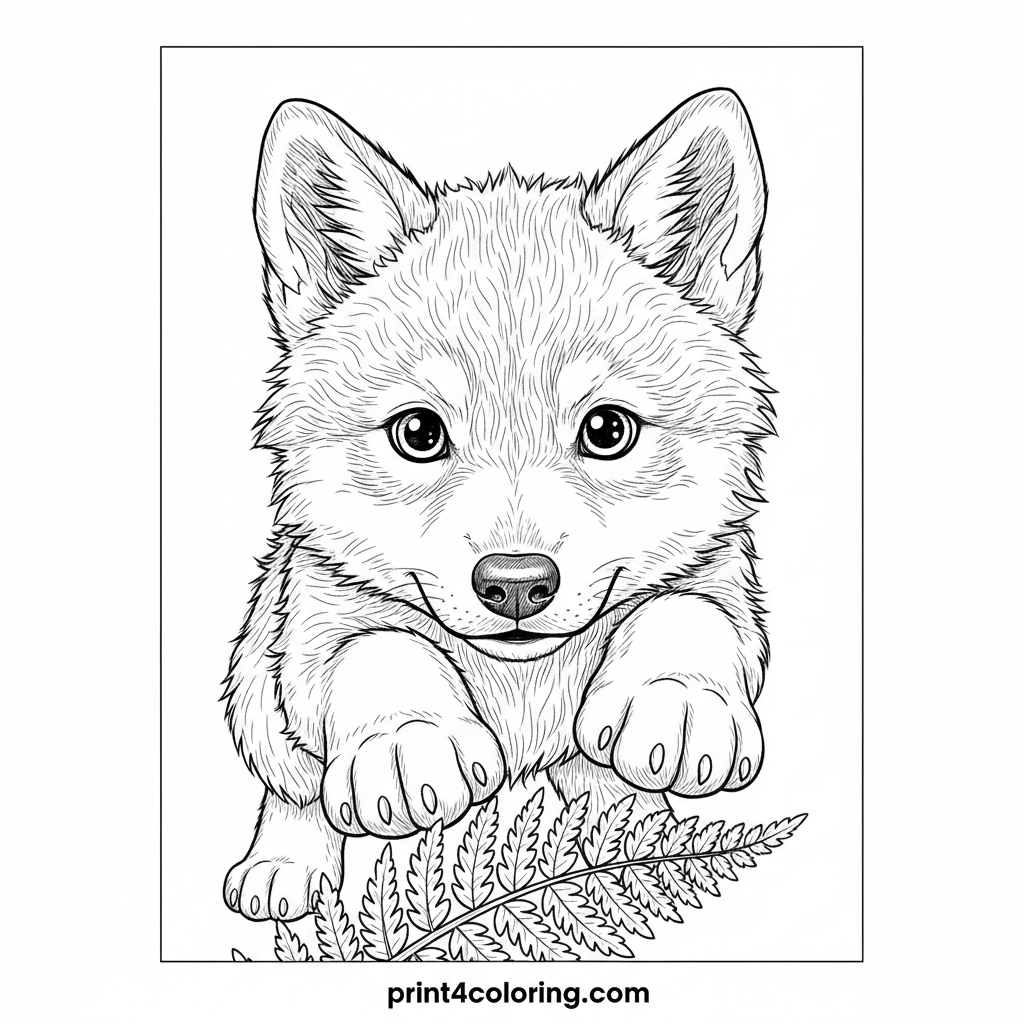 Dive into a charming close-up of an adorable, fluffy wolf pup with big, curious eyes, playfully pouncing on a beautifully detailed fern. This expert-level page invites you to bring its soft fur, intricate foliage, and a sun-dappled forest clearing to life with your colors.
