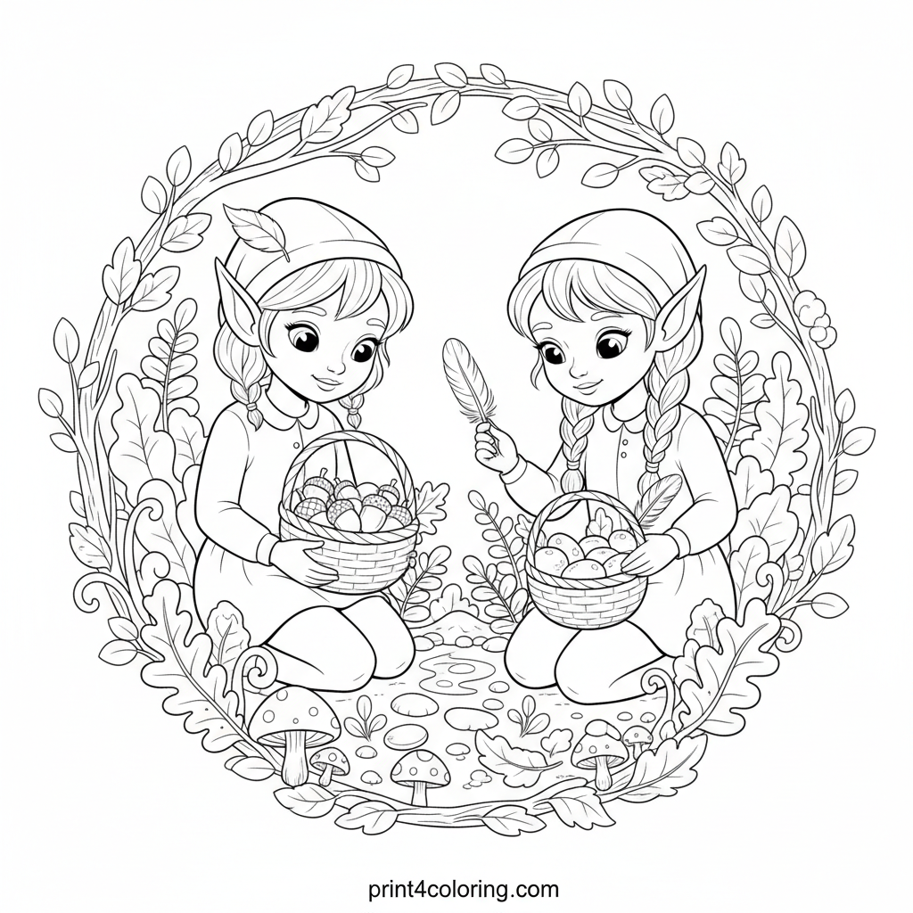 Embark on a delightful journey with two nimble elves deep in an enchanted forest! Watch them carefully gather beautiful acorns, smooth river stones, and delicate feathers into their tiny woven baskets. This detailed scene, set amidst rich forest undergrowth, awaits your vibrant colors to bring its magical charm to life.