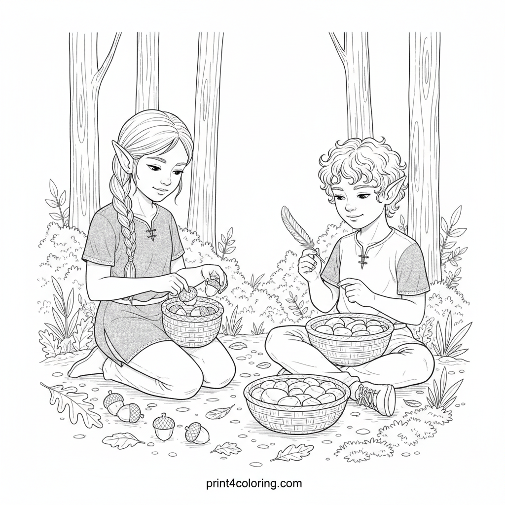 Journey into an enchanting forest where two diligent elves are on a special mission! With keen eyes and gentle hands, they carefully gather nature's wonders: shiny acorns, smooth river stones, and delicate feathers, filling their woven baskets amidst lush, detailed undergrowth. A magical scene waiting for your colors!