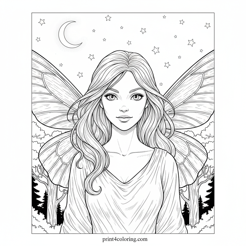 Soar into a magical night with this graceful fairy! Her detailed, iridescent wings shimmer under a realistic crescent moon and countless stars. Frame her flight with finely drawn tree silhouettes, revealing a serene forest. A captivating scene for expert colorists to bring to life with vibrant hues and delicate shading.