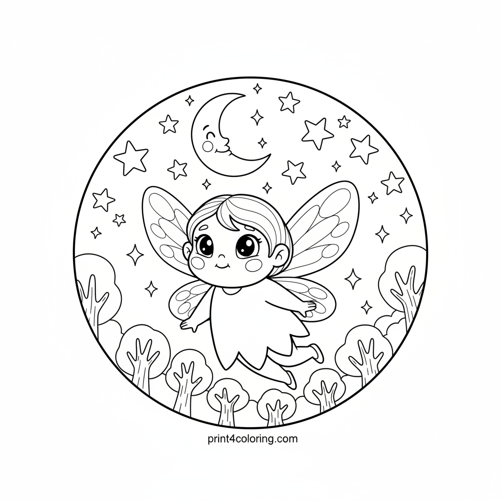 Soar into a magical night where a graceful fairy with shimmering wings glides through a tranquil sky. A brilliant crescent moon and twinkling stars illuminate her path above a serene forest, detailed with textured trees. Bring this cozy, enchanting scene to life with your favorite colors and imagination.